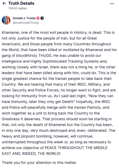 ඇමෙරිකා එක්සත් ජනපද ජනාධිපති ඩොනල්ඩ් ට්රම්ප් සිය Truth Social ගිණුමේ සටහනක් තබමින් පවසා සිටින්නේ “ඉතිහාසයේ වඩාත් ම නපුරු මිනිසුන්ගෙන් කෙනෙකු වුණු කමේනි මිය ගොස් ඇති බවයි. වැඩිදුරටත් එම සටහනේ සිය අදහස් දක්වමින් “මෙය ඉරානයේ ජනතාවට පමණක් නොව, සියලුම ශ්රේෂ්ඨ ඇමරිකානුවන්ට වූ යුක්තිය,” බව ඔහු පවසනවා. “මෙය ඉරාන ජනතාවට තම රට ආපසු ලබා ගැනීමට ඇති එක ම විශාලතම අවස්ථාව” බව ද ඔහු සිය ඔහුගේ දීර්ඝ සටහනේ දක්වා තිබෙනවා.